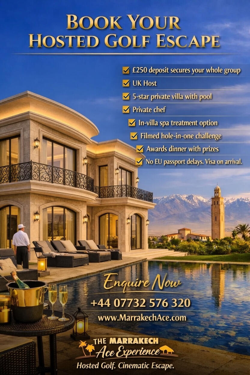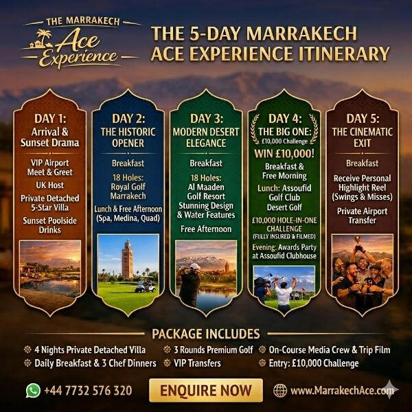 5 days. 3 world-class golf courses. A £10,000 hole-in-one challenge. A private villa with chef. An awards night you'll never forget. Everything taken care of by your UK host based in Marrakech This is not your average golf trip, this is the Marrakech Ace Experience.
